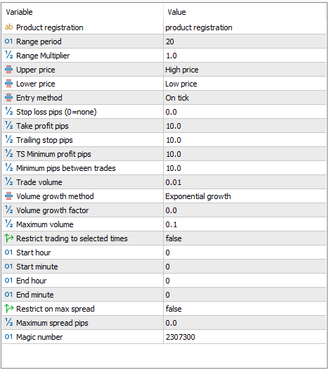 Range MultiplierThis is used to multiply the standard range width used to set the upper and lower boundaries where trading will occur.